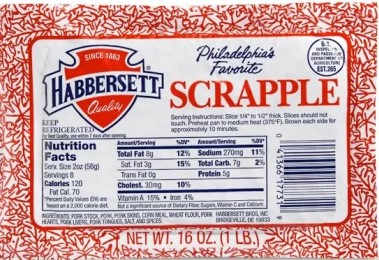 Note: after the pudding “sets,” it is sliced and fried like sausage. Traditional scrapple contains buckwheat flour which Habbersett’s scrapple omits. Even so, Habbersett’s a good example of rural cookery from a firm founded in 1863 in Delaware County, Pennsylvania.